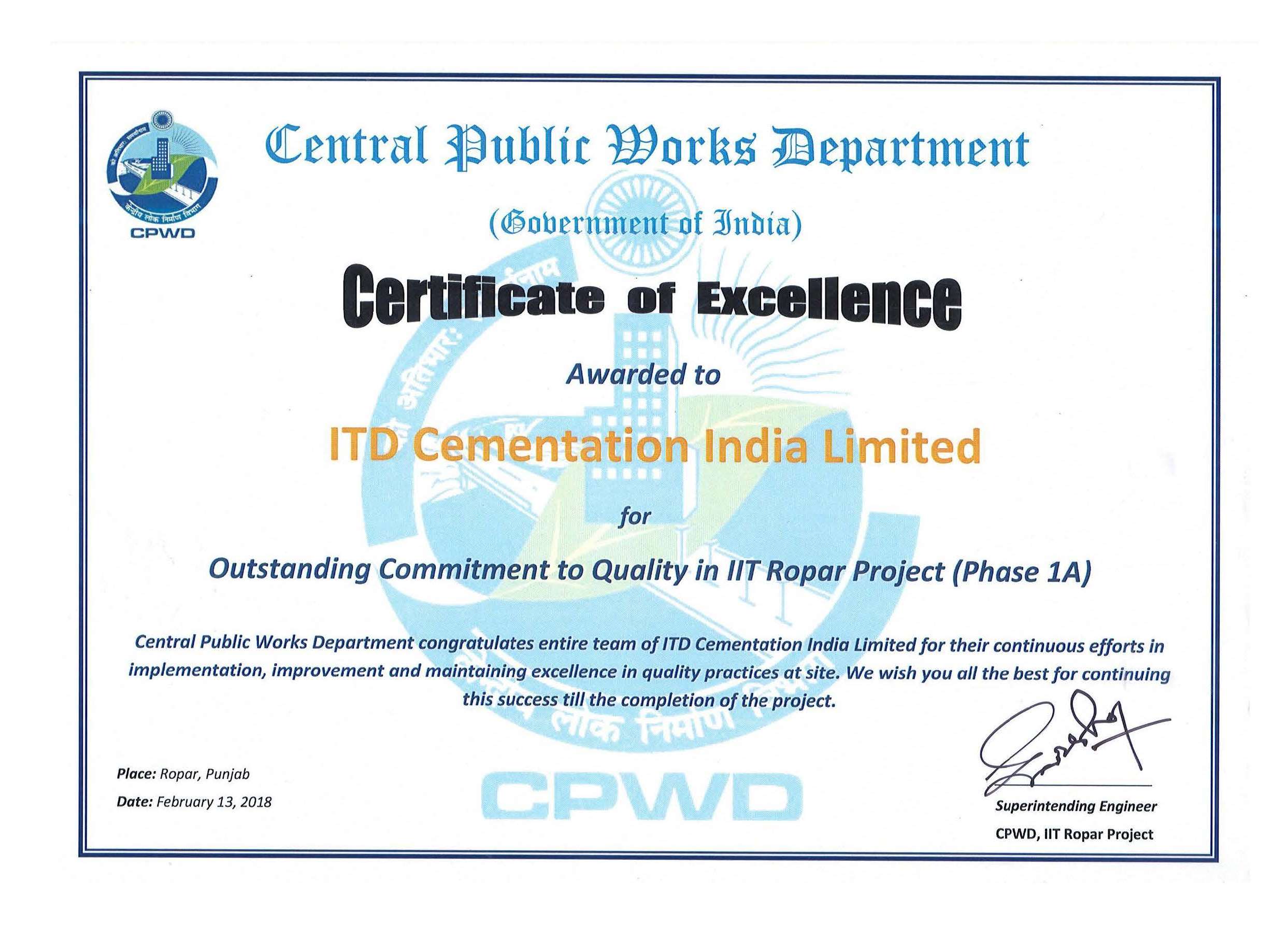 Certificate of Excellence for Outstanding Commitment to Quality for IIT Ropar Project (Phase 1A) from CPWD.