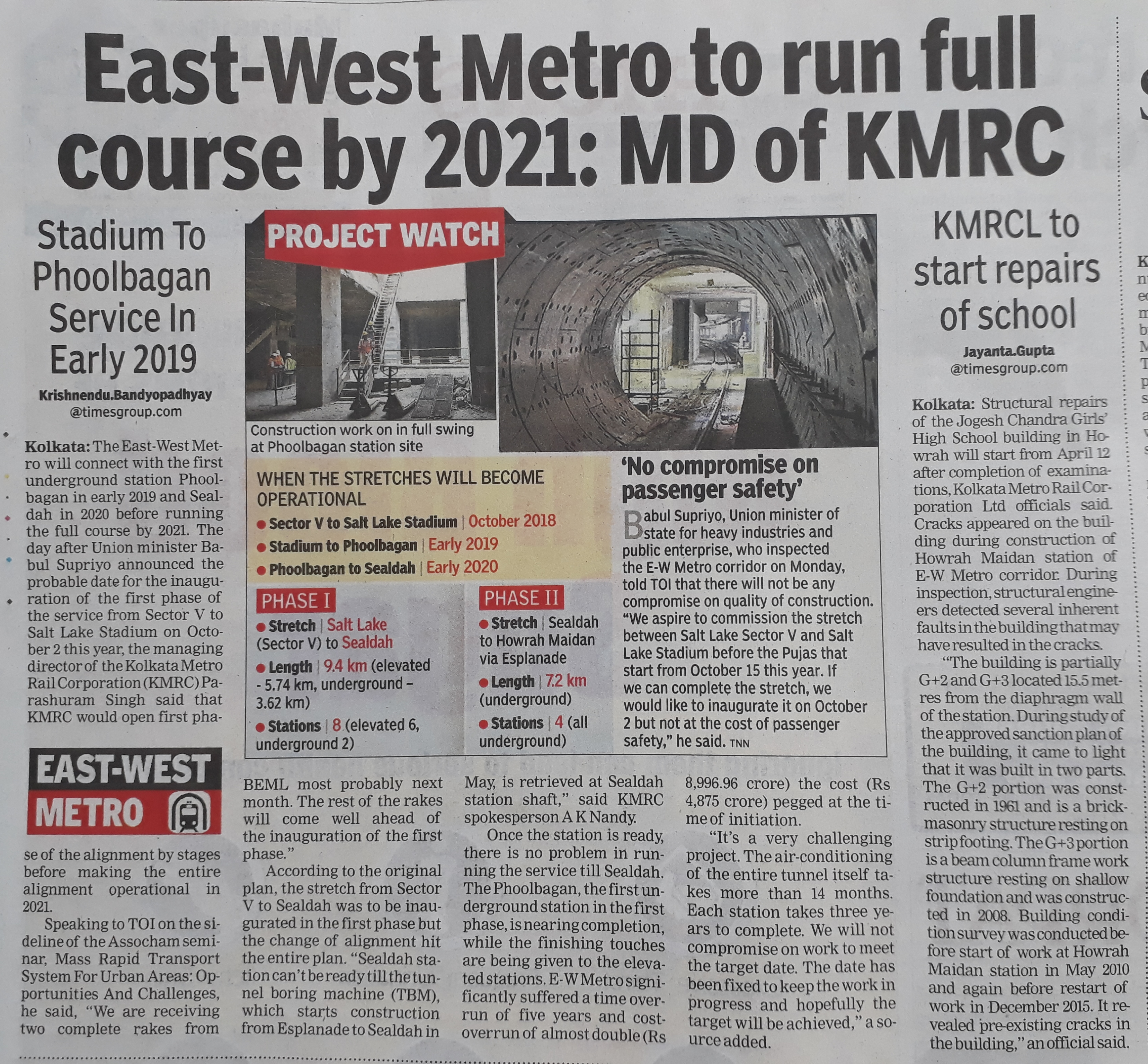 KMRCL East-West Under Ground 2 metro project information has published in Times of India.