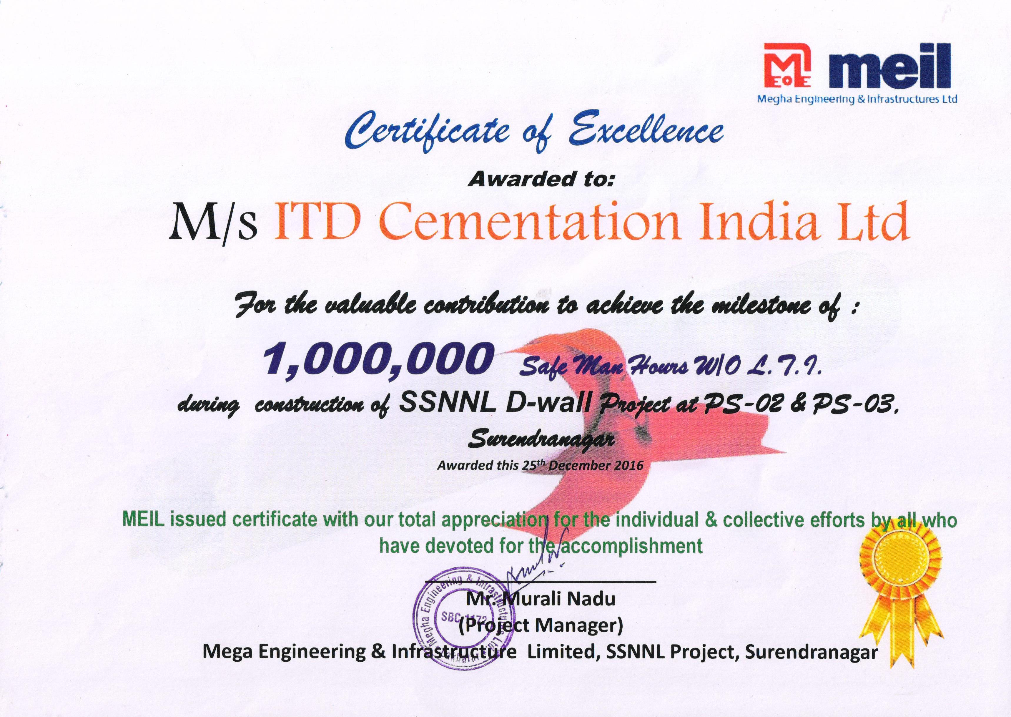 Certificate of Excellence received from Mega Engineering & Infrastructure Limited, SSNNL Project, Surendranagar, for achieving one Millions safe man hours.
