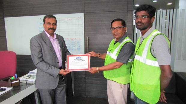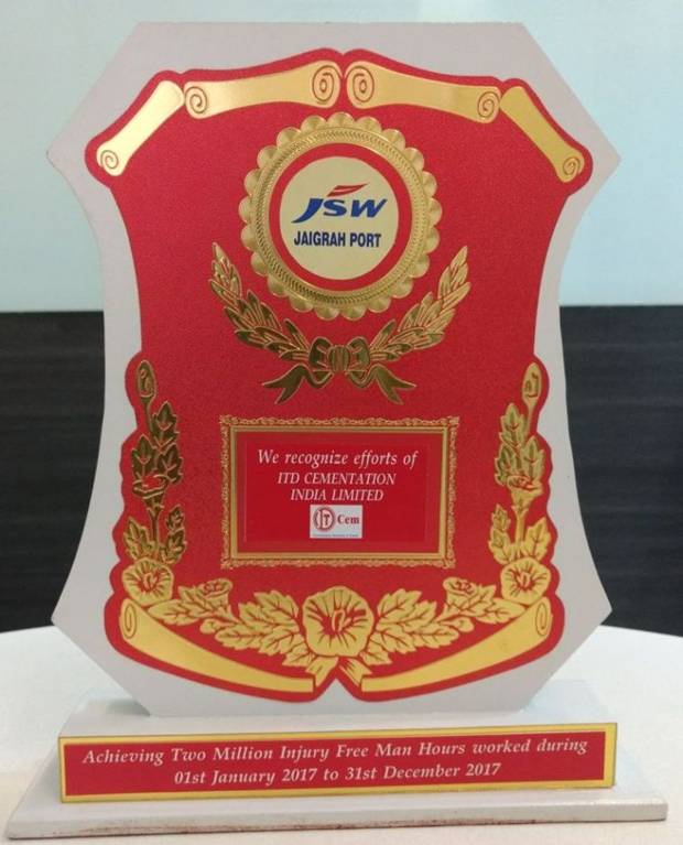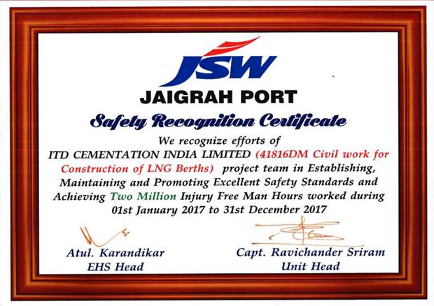 Safety Recognition Certificate and Medal from JSW for achieving 2 million injury free man hours for Establishing, Maintaining and Promoting Excellent Safety standards for the Civil work for Construction of LNG Berth at Jaigad Port